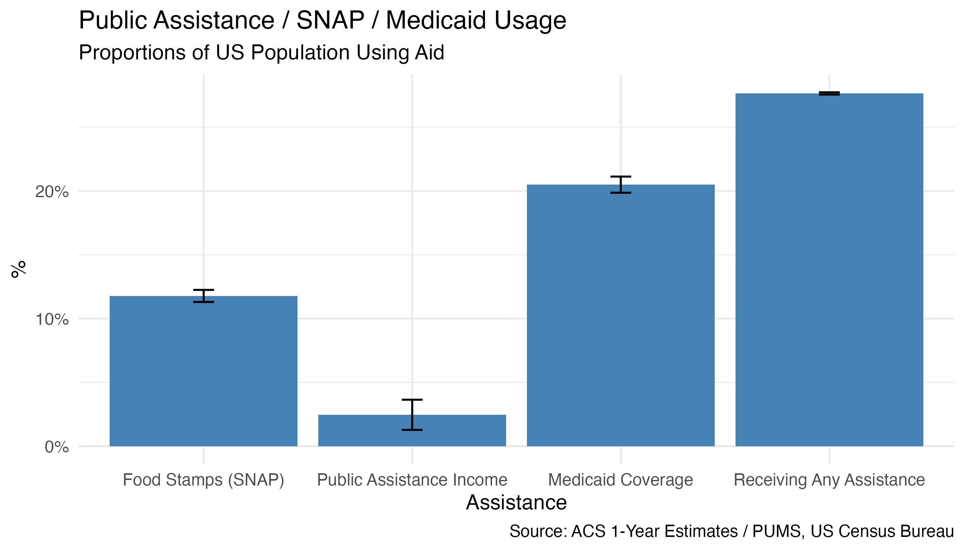 Just so we have some benchmarks, let’s look at the overall US participation of SNAP, public assistance income, and Medicaid. Using 2023 ACS 5-Year estimates, we can see that 11.8% of households in the United States reported SNAP benefits in 2023, 2.7% of households in the United States reported public assistance income, and 20.7% of individuals reported Medicaid coverage. NB: this is not limited to American citizens; the ACS surveys include citizen and non-citizen respondents.