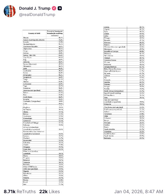 On January 4, 2026, the President of the United States “truthed” out a table without comment or citation. The table was simple enough: one column listed “Country of birth,” the other “Percent of immigrant households receiving assistance.”